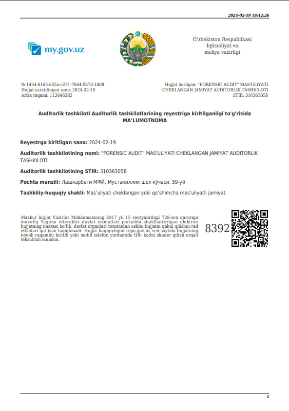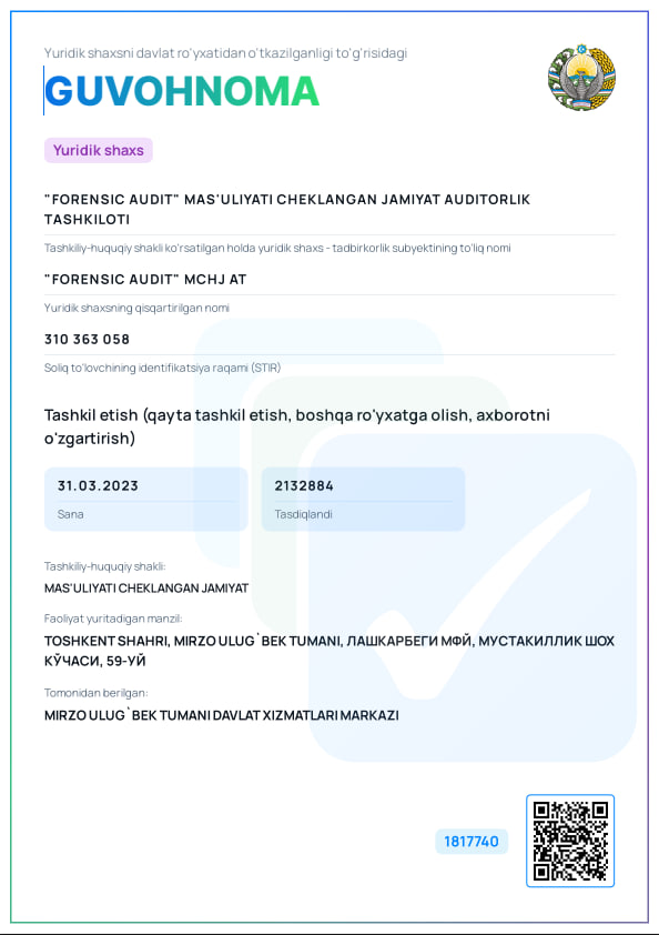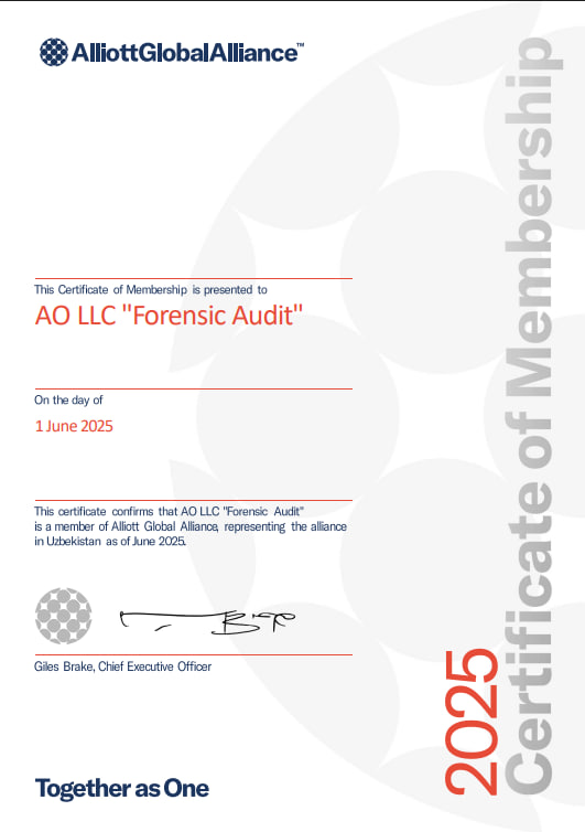 АО ООО «FORENSIC AUDIT», является первой аудиторской организацией в Узбекистане с основным видом деятельности Форензик. Компания, которая просвещает в Узбекистане Форензик процедуры, издает тематические статьи и проводит обучающие семинары с учетом знаний и опыта, полученного от Международной ассоциации ACFE.